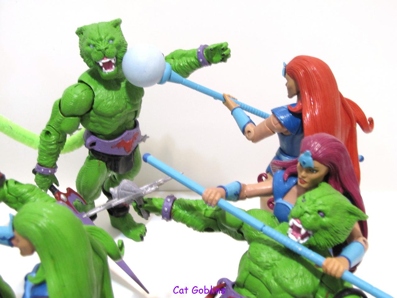 These are Catra's Cat Goblins from The Story of She-Ra mini comic. Catra had her own army of Cat Goblins who do her bidding before the Horde Troopers ever showed up in the She-Ra mini-comics. I got the cat heads & belts from Karak Nul & the cat crossbows from Evil Mike.
